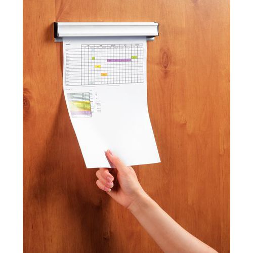 Aluminiumprofil med plastrullar som pappersklämma. På ovansidan är Alu utformad så att det går att lägga pennor där. I urholkningen på framsidan kan man med hjälp av t.ex. en etikett enkelt anbringa text eller en färgrand. Flera klämmor kan enkelt kopplas samman intill varandra. Upphängning med medföljande skruvar eller dubbelhäftande tejp.