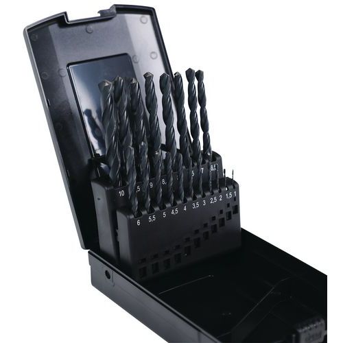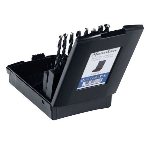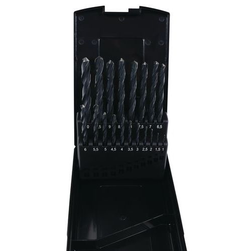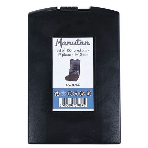 | Varunamn | Uppsättning med 19 cylindriska valsade HSS-bitar, Antal delar: 19, Användning: Borra, Material: Stål |