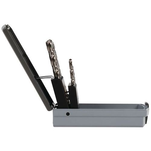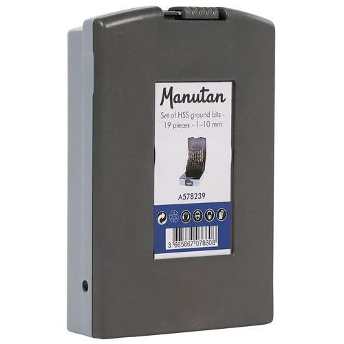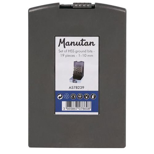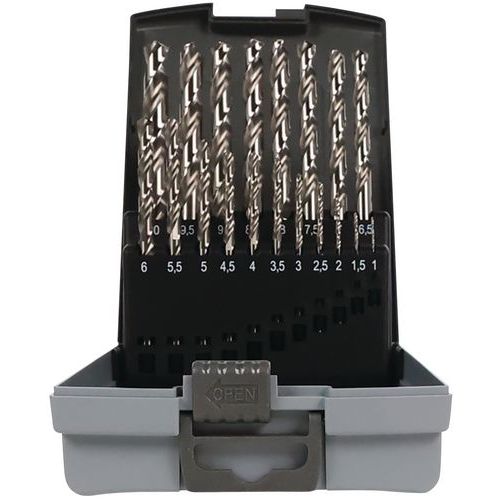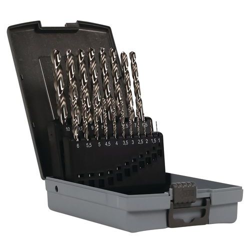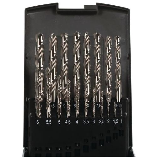 | Varunamn | Uppsättning med 19 cylindriska valsade HSS-bitar, Antal delar: 19, Användning: Borra, Material: Stål |
