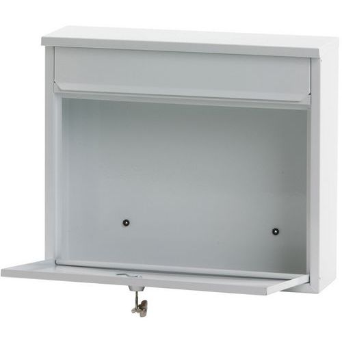- Vägghängd brevlåda i metall med lock och låsbar lucka framtill. Öppning: 32 x 4 cm.