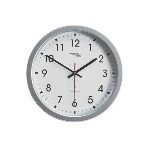 - Radiokontrollerad väggklocka i plast med silverfärgad ram, vit urtavla och svarta tecken. Att en klocka är radiokontrollerad innebär att den har en inbyggd radiomottagare för mottagning av radiosignal för exakt gångtid. Signalen sänds från Frankfurt i Tyskland och räckvidden är ca 1500 km.