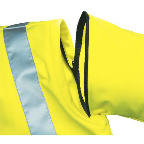Åtdragning med resår med snoddstopp. Reflexband av typen 3M™ Scotchlite™. Rak dubbel krage.