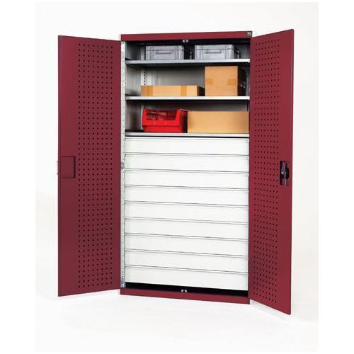 Inredning: 9 styck lådor, höjd 125 mm, med 75 kg kapacitet/låda vid fullt utdrag (100%). 3 styck fasta hyllplan i galvaniserad stål med 100 kg kapacitet/hylla. Verktygspanel/perforerad panel i dörrarna.