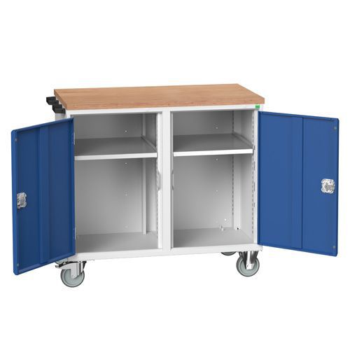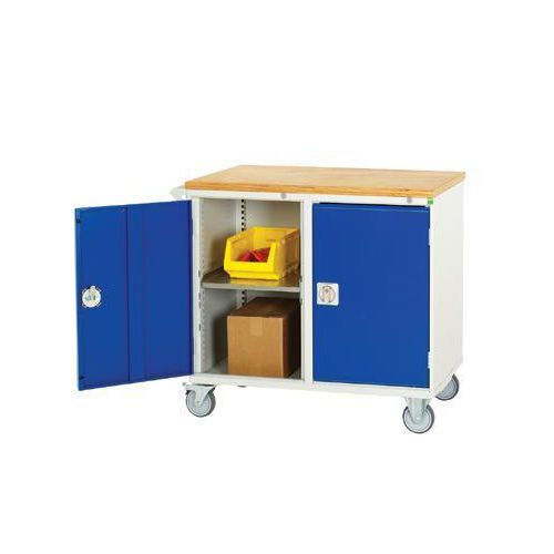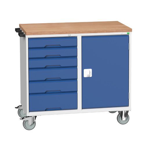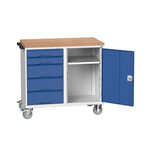 Verkstadsvagnar Verso med 30 mm massiv multiplexskiva. Centrallås med 2 nycklar. Kullagrade lådor med utdragsspärr. Kraftiga hjul varav två med broms. Flyttbara hyllplan i galvat stål.