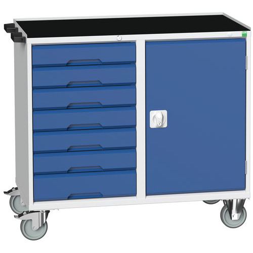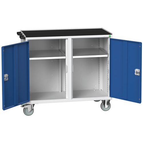 Svetsad stålplåtkonstruktion. Dörrfacket är utrustat med en höjdjusterbar hylla i galvaniserat stål. Belastning per hyllplan 60 kg. Lådor öppnas 100 %, belastning 50 kg. Säkerhetsmekanism som förhindrar oavsiktlig öppning av lådor. Handtag 4 hjul diameter 125 mm, 2 fasta och 2 vridbara med broms. Maximal tillåten belastning 200 kg Bredd 1050 mm. Höjd 980 mm, djup 600 mm med 30 mm tjock topp. Höjd 965 mm, djup 550 mm med 3-kantig topp.